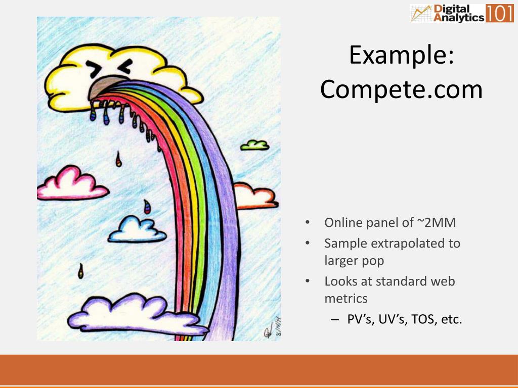 Example: Compete.com Online panel of ~2MM Sample extrapolated to larger pop Looks at standard web metrics • PV’s, UV’s, TOS, etc.