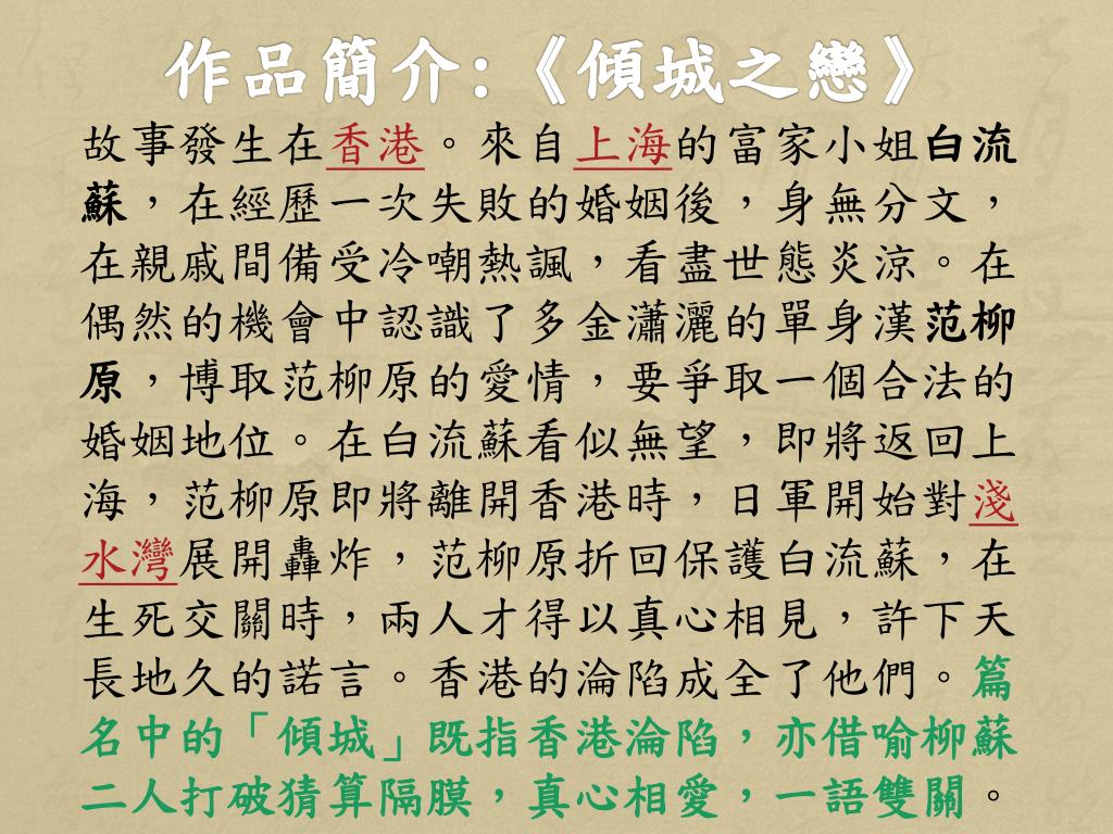 作品簡介:《傾城之戀》 故事發生在香港。來自上海的富家小姐白流蘇,在經歷一次失敗的婚姻後,身無分文,在親戚間備受冷嘲熱諷,看盡世態炎涼。在偶然的機會中認識了多金瀟灑的單身漢范柳原,博取范柳原的愛情,要爭取一個合法的婚姻地位。在白流蘇看似無望,即將返回上海,范柳原即將離開香港時,日軍開始對淺水灣展開轟炸,范柳原折回保護白流蘇,在生死交關時,兩人才得以真心相見,許下天長地久的諾言。香港的淪陷成全了他們。篇名中的「傾城」既指香港淪陷,亦借喻柳蘇二人打破猜算隔膜,真心相愛,一語雙關。