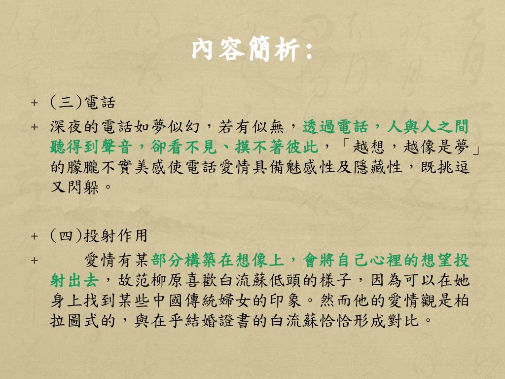內容簡析: • (三)電話 • 深夜的電話如夢似幻,若有似無,透過電話,人與人之間聽得到聲音,卻看不見、摸不著彼此,「越想,越像是夢」的朦朧不實美感使電話愛情具備魅感性及隱藏性,既挑逗又閃躲。 • (四)投射作用 • 愛情有某部分構築在想像上,會將自己心裡的想望投射出去,故范柳原喜歡白流蘇低頭的樣子,因為可以在她身上找到某些中國傳統婦女的印象。然而他的愛情觀是柏拉圖式的,與在乎結婚證書的白流蘇恰恰形成對比。