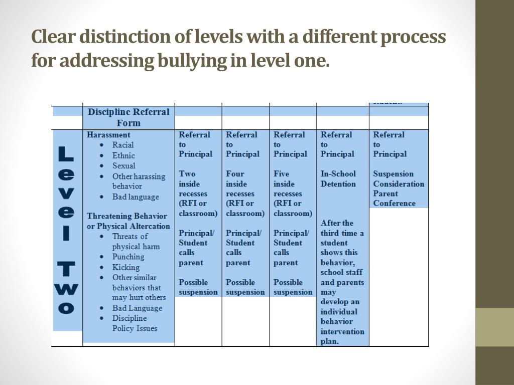 Clear distinction of levels with a different process for addressing bullying in level one.