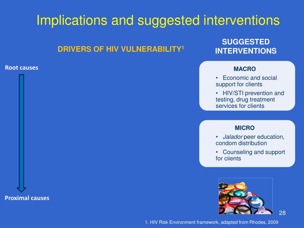 MICRO • Jaladorpeer education, condom distribution • Counseling and support for ciients • MACRO • Economic and social support for clients • HIV/STI prevention and testing, drug treatment services for clients Implications and suggested interventions SUGGESTED INTERVENTIONS DRIVERS OF HIV VULNERABILITY1 Root causes Proximal causes 1. HIV Risk Environment framework, adapted from Rhodes, 2009