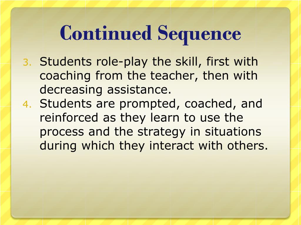 Continued Sequence • Students role-play the skill, first with coaching from the teacher, then with decreasing assistance. • Students are prompted, coached, and reinforced as they learn to use the process and the strategy in situations during which they interact with others.