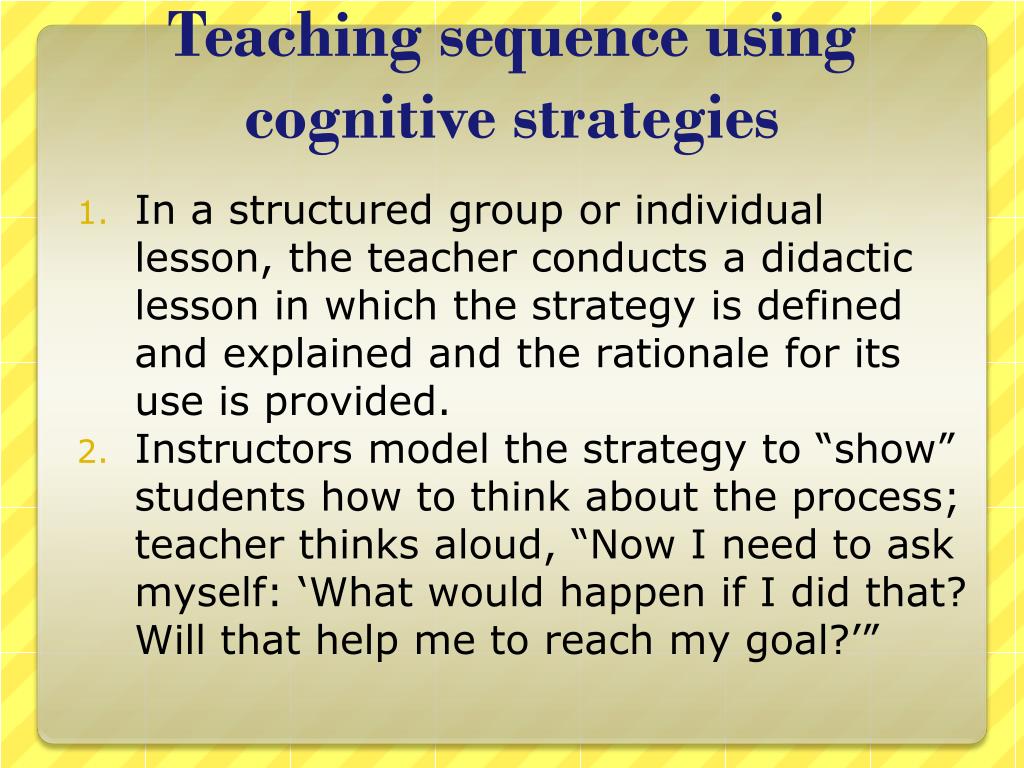 Teaching sequence using cognitive strategies • In a structured group or individual lesson, the teacher conducts a didactic lesson in which the strategy is defined and explained and the rationale for its use is provided. • Instructors model the strategy to “show” students how to think about the process; teacher thinks aloud, “Now I need to ask myself: ‘What would happen if I did that? Will that help me to reach my goal?’”