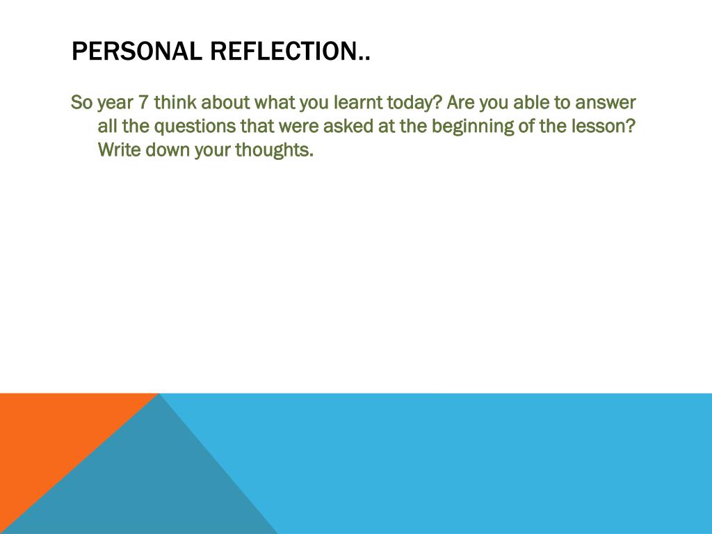 Personal reflection.. • So year 7 think about what you learnt today? Are you able to answer all the questions that were asked at the beginning of the lesson? Write down your thoughts.