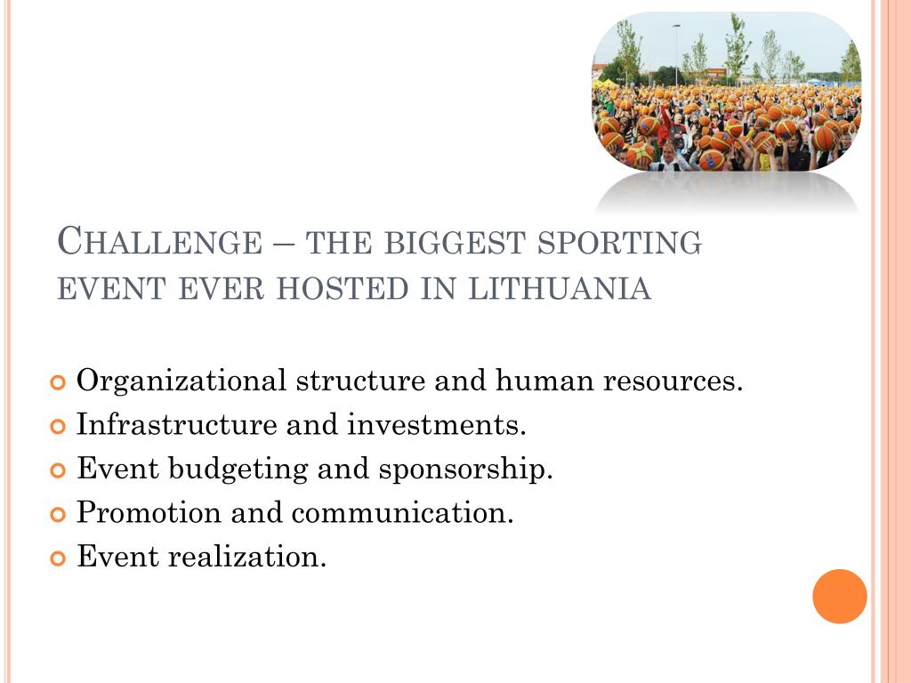 Challenge – the biggest sporting event ever hosted in lithuania • Organizational structure and human resources. • Infrastructure and investments. • Event budgeting and sponsorship. • Promotion and communication. • Event realization.