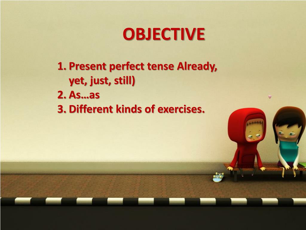 OBJECTIVE Presentperfect tense Already, yet, just, still) As…as Differentkinds of exercises.