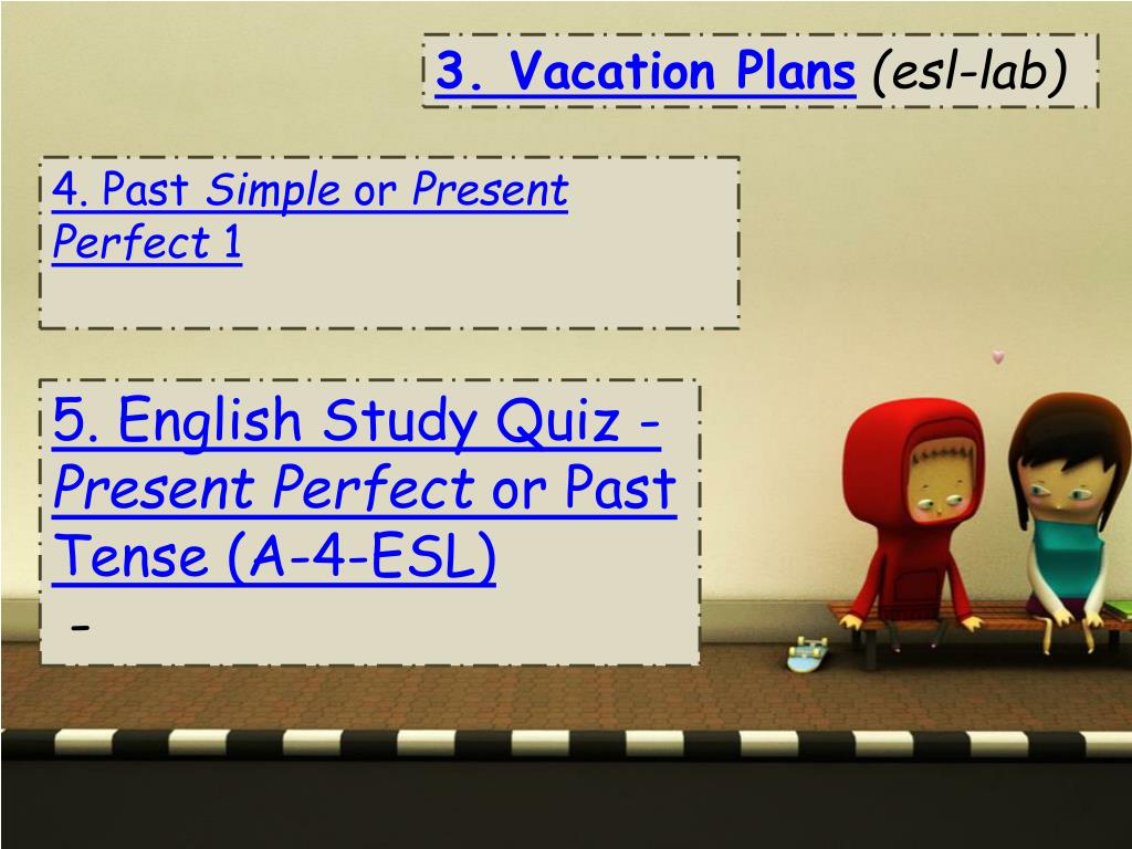 3. VacationPlans(esl-lab) 4. Past Simple or Present Perfect 1 5. English Study Quiz - Present Perfect or Past Tense (A-4-ESL) -