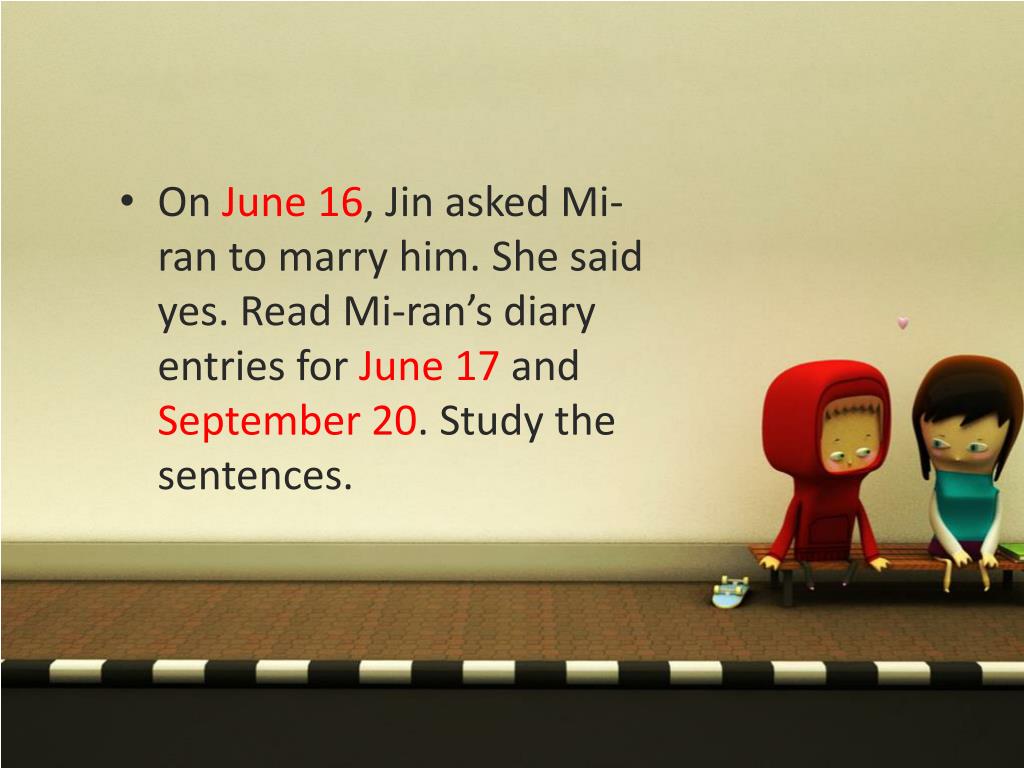 On June 16, Jin asked Mi-ran to marry him. She said yes. Read Mi-ran’s diary entries for June 17 and September 20. Study the sentences.