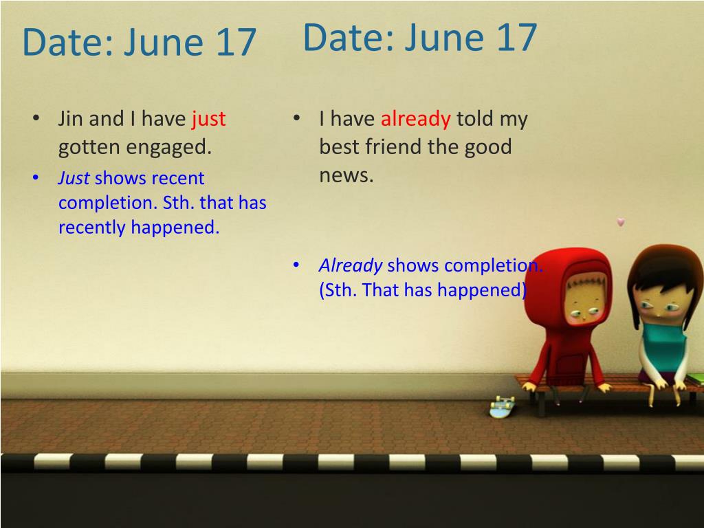 Date: June 17 Date: June 17 • Jin and I have just gotten engaged. • Just shows recent completion. Sth. that has recently happened. • I have already told my best friend the good news. • Already shows completion. (Sth. That has happened)