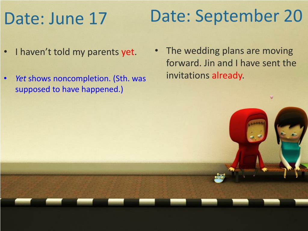 Date: September 20 Date: June 17 • The wedding plans are moving forward. Jin and I have sent the invitations already. • I haven’t told my parents yet. • Yet shows noncompletion. (Sth. was supposed to have happened.)