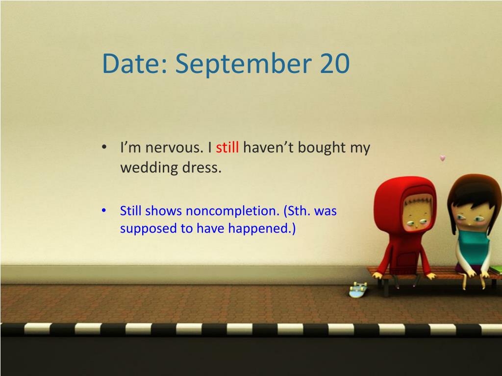 Date: September 20 • I’m nervous. I still haven’t bought my wedding dress. • Still shows noncompletion. (Sth. was supposed to have happened.)