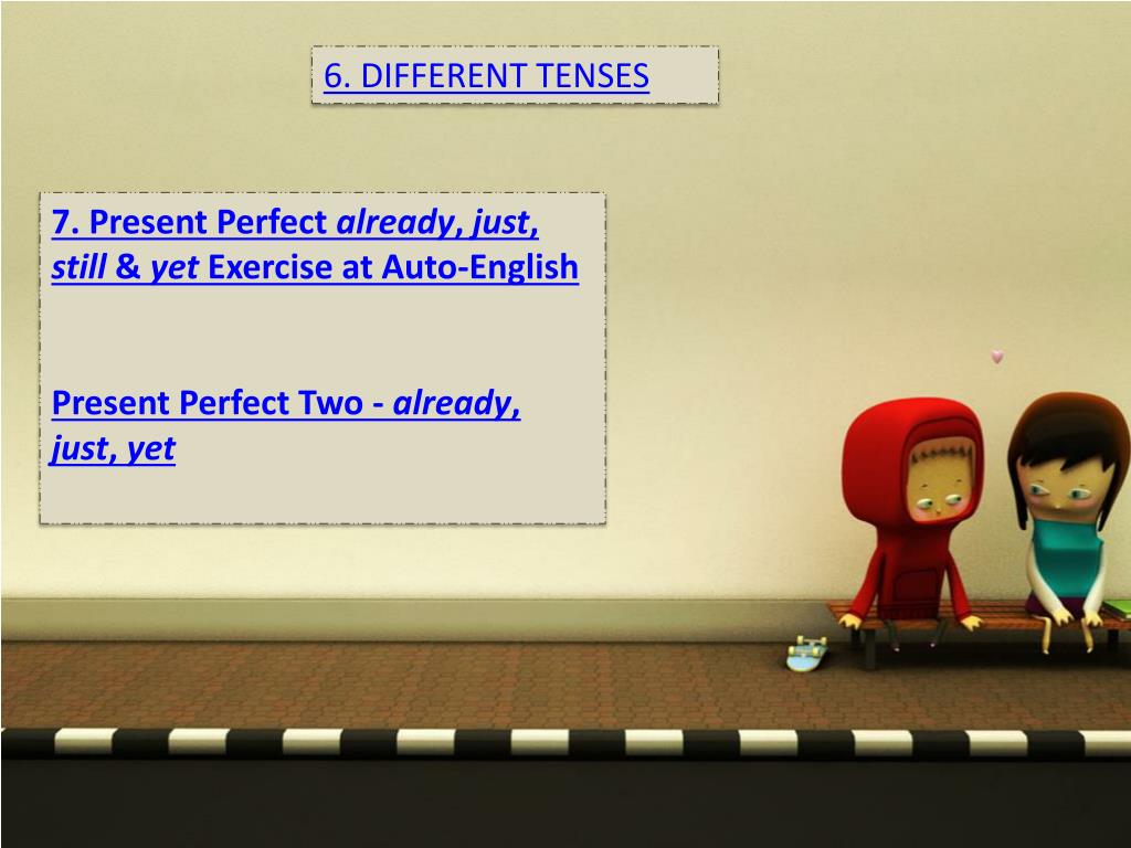 6. DIFFERENT TENSES 7. Present Perfect already, just, still & yet Exercise at Auto-English Present Perfect Two - already, just, yet