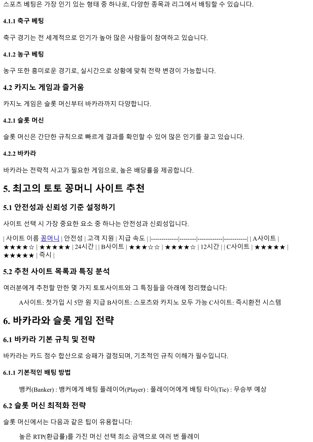 스포츠베팅은가장인기있는형태중하나로, 다양한종목과리그에서배팅할수있습니다. 4.1.1 축구베팅 축구경기는전세계적으로인기가높아많은사람들이참여하고있습니다. 4.1.2 농구베팅 농구또한흥미로운경기로, 실시간으로상황에맞춰전략변경이가능합니다. 4.2 카지노게임과즐거움 카지노게임은슬롯머신부터바카라까지다양합니다. 4.2.1 슬롯머신 슬롯머신은간단한규칙으로빠르게결과를확인할수있어많은인기를끌고있습니다. 4.2.2 바카라 바카라는전략적사고가필요한게임으로, 높은배당률을제공합니다. 5. 최고의토토꽁머니사이트추천 5.1 안전성과신뢰성기준설정하기 사이트선택시가장중요한요소중하나는안전성과신뢰성입니다. | 사이트이름꽁머니 | 안전성 | 고객지원 | 지급속도 | |-------------|--------|------------|-----------| | A사이트 | ★★★★☆ | ★★★★★ | 24시간 | | B사이트 | ★★★☆☆ | ★★★★☆ | 12시간 | | C사이트 | ★★★★★ | ★★★★★ | 즉시 | 5.2 추천사이트목록과특징분석 여러분에게추천할만한몇가지토토사이트와그특징들을아래에정리했습니다: A사이트: 첫가입시 5만원지급 B사이트: 스포츠와카지노모두가능 C사이트: 즉시환전시스템 6. 바카라와슬롯게임전략 6.1 바카라기본규칙및전략 바카라는카드점수합산으로승패가결정되며, 기초적인규칙이해가필수입니다. 6.1.1 기본적인배팅방법 뱅커(Banker) : 뱅커에게배팅플레이어(Player) : 플레이어에게배팅타이(Tie) : 무승부예상 6.2 슬롯머신최적화전략 슬롯머신에서는다음과같은팁이유용합니다: 높은 RTP(환급률)를가진머신선택최소금액으로여러번플레이