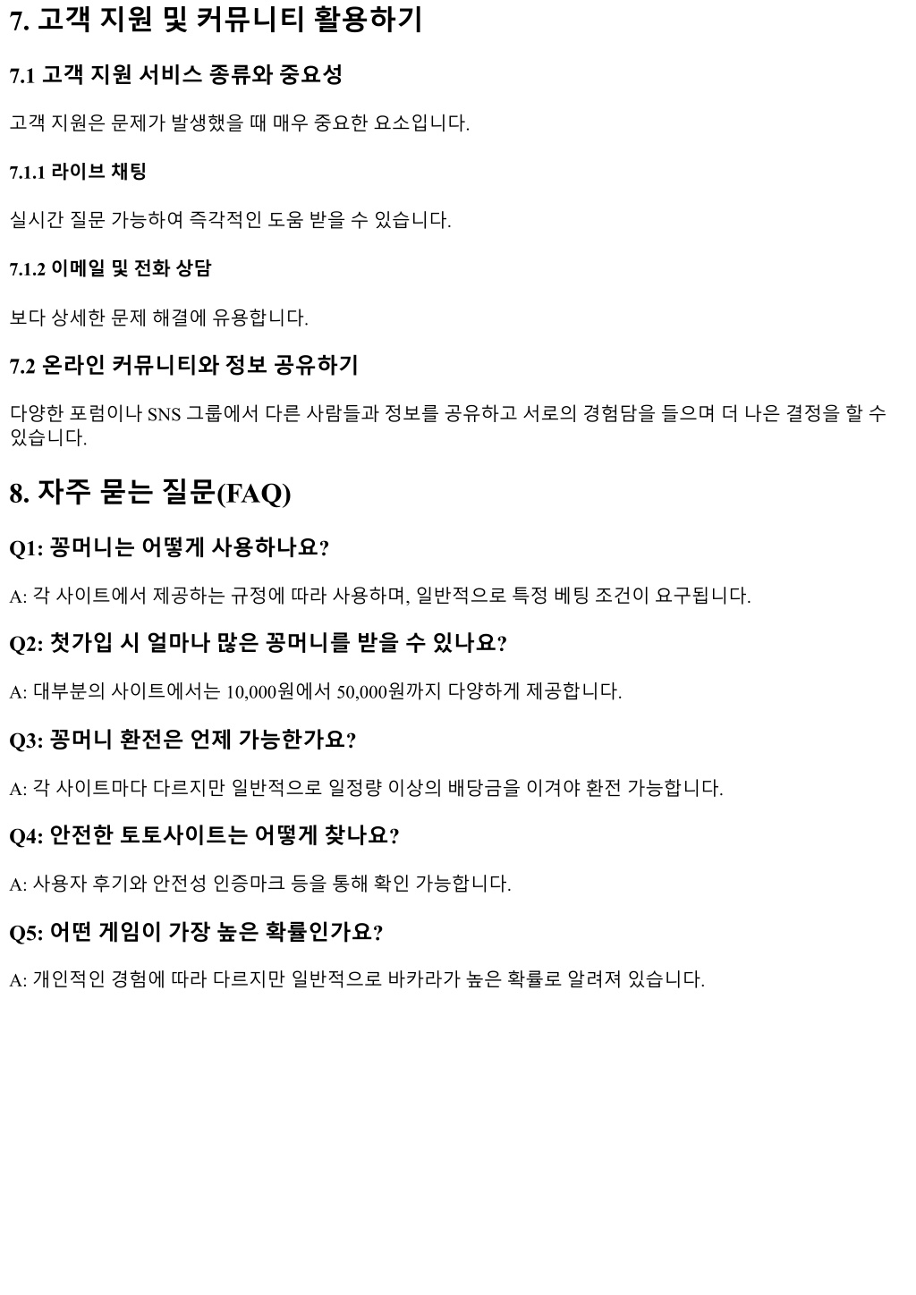 7. 고객지원및커뮤니티활용하기 7.1 고객지원서비스종류와중요성 고객지원은문제가발생했을때매우중요한요소입니다. 7.1.1 라이브채팅 실시간질문가능하여즉각적인도움받을수있습니다. 7.1.2 이메일및전화상담 보다상세한문제해결에유용합니다. 7.2 온라인커뮤니티와정보공유하기 다양한포럼이나 SNS 그룹에서다른사람들과정보를공유하고서로의경험담을들으며더나은결정을할수 있습니다. 8. 자주묻는질문(FAQ) Q1: 꽁머니는어떻게사용하나요? A: 각사이트에서제공하는규정에따라사용하며, 일반적으로특정베팅조건이요구됩니다. Q2: 첫가입시얼마나많은꽁머니를받을수있나요? A: 대부분의사이트에서는 10,000원에서 50,000원까지다양하게제공합니다. Q3: 꽁머니환전은언제가능한가요? A: 각사이트마다다르지만일반적으로일정량이상의배당금을이겨야환전가능합니다. Q4: 안전한토토사이트는어떻게찾나요? A: 사용자후기와안전성인증마크등을통해확인가능합니다. Q5: 어떤게임이가장높은확률인가요? A: 개인적인경험에따라다르지만일반적으로바카라가높은확률로알려져있습니다.