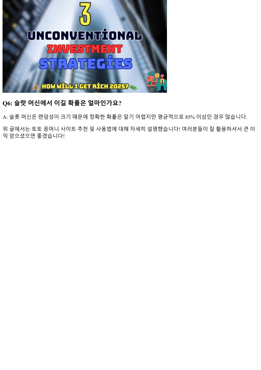 Q6: 슬랏머신에서이길확률은얼마인가요? A: 슬롯머신은랜덤성이크기때문에정확한확률은알기어렵지만평균적으로 85% 이상인경우많습니다. 위글에서는토토꽁머니사이트추천및사용법에대해자세히설명했습니다! 여러분들이잘활용하셔서큰이 익얻으셨으면좋겠습니다!
