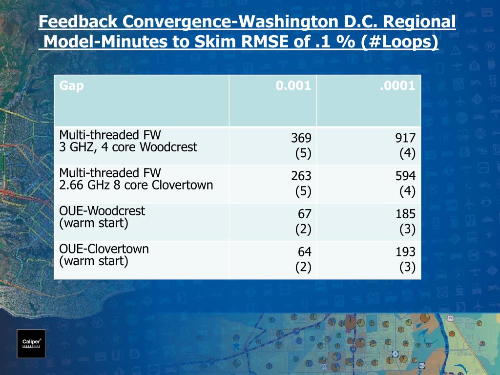 Test Environment • Well-calibrated regional model for Washington DC • 2500 zones, 6 purposes, 3 time periods, 5 assignment classes • Feedback through distribution, mode choice, & assignment • Calibrated to Relative Gap of .001, Skim matrix root mean square error < 1% • 80 – 170 Assignment iterations and 4 feedback loops • TransCAD 4.8/5.0 environment • Initial congested times from 5+ loop runs