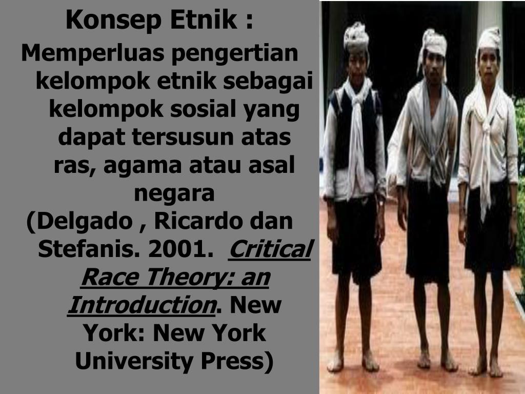 KonsepEtnik : Memperluaspengertiankelompoketniksebagaikelompoksosial yang dapattersusunatasras, agama atauasalnegara (Delgado , Ricardo danStefanis. 2001. Critical Race Theory: an Introduction. New York: New York University Press)