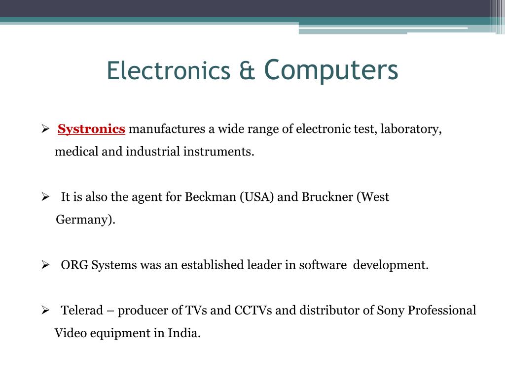 Electronics & Computers • Systronics manufactures a wide range of electronic test, laboratory, medical and industrial instruments. • It is also the agent for Beckman (USA) and Bruckner (West Germany). • ORG Systems was an established leader in software development. • Telerad – producer of TVs and CCTVs and distributor of Sony Professional Video equipment in India.