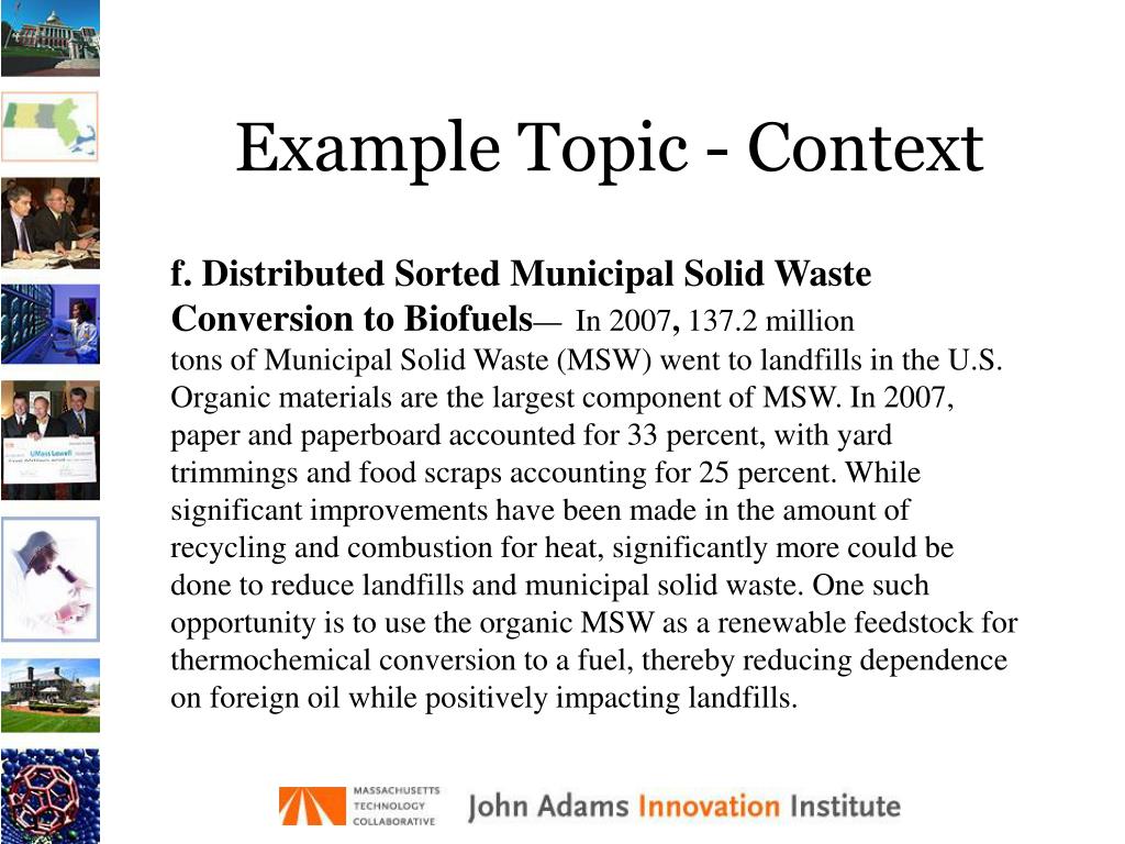 Example Topic - Context f. Distributed Sorted Municipal Solid Waste Conversion to Biofuels— In 2007, 137.2 million tons of Municipal Solid Waste (MSW) went to landfills in the U.S. Organic materials are the largest component of MSW. In 2007, paper and paperboard accounted for 33 percent, with yard trimmings and food scraps accounting for 25 percent. While significant improvements have been made in the amount of recycling and combustion for heat, significantly more could be done to reduce landfills and municipal solid waste. One such opportunity is to use the organic MSW as a renewable feedstock for thermochemical conversion to a fuel, thereby reducing dependence on foreign oil while positively impacting landfills.
