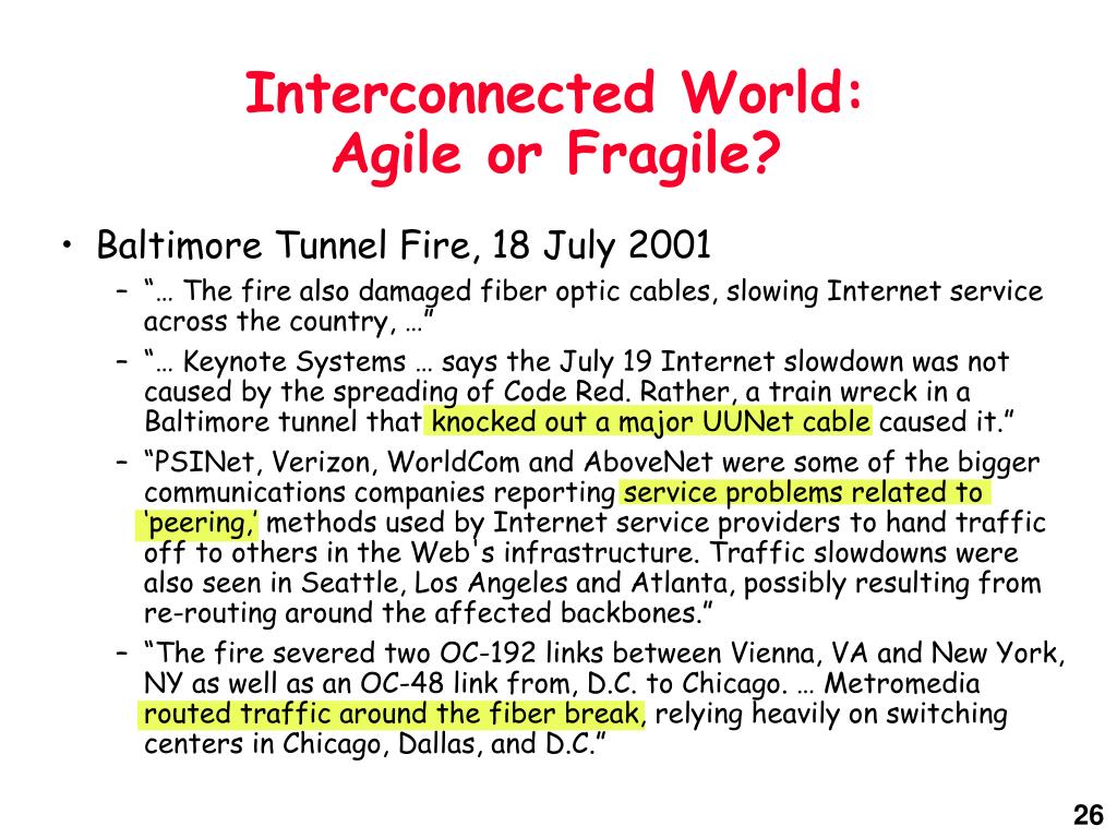 Interconnected World:Agile or Fragile? • Baltimore Tunnel Fire, 18 July 2001 • “… The fire also damaged fiber optic cables, slowing Internet service across the country, …” • “… Keynote Systems … says the July 19 Internet slowdown was not caused by the spreading of Code Red. Rather, a train wreck in a Baltimore tunnel that knocked out a major UUNet cable caused it.” • “PSINet, Verizon, WorldCom and AboveNet were some of the bigger communications companies reporting service problems related to ‘peering,’ methods used by Internet service providers to hand traffic off to others in the Web's infrastructure. Traffic slowdowns were also seen in Seattle, Los Angeles and Atlanta, possibly resulting from re-routing around the affected backbones.” • “The fire severed two OC-192 links between Vienna, VA and New York, NY as well as an OC-48 link from, D.C. to Chicago. … Metromedia routed traffic around the fiber break, relying heavily on switching centers in Chicago, Dallas, and D.C.”