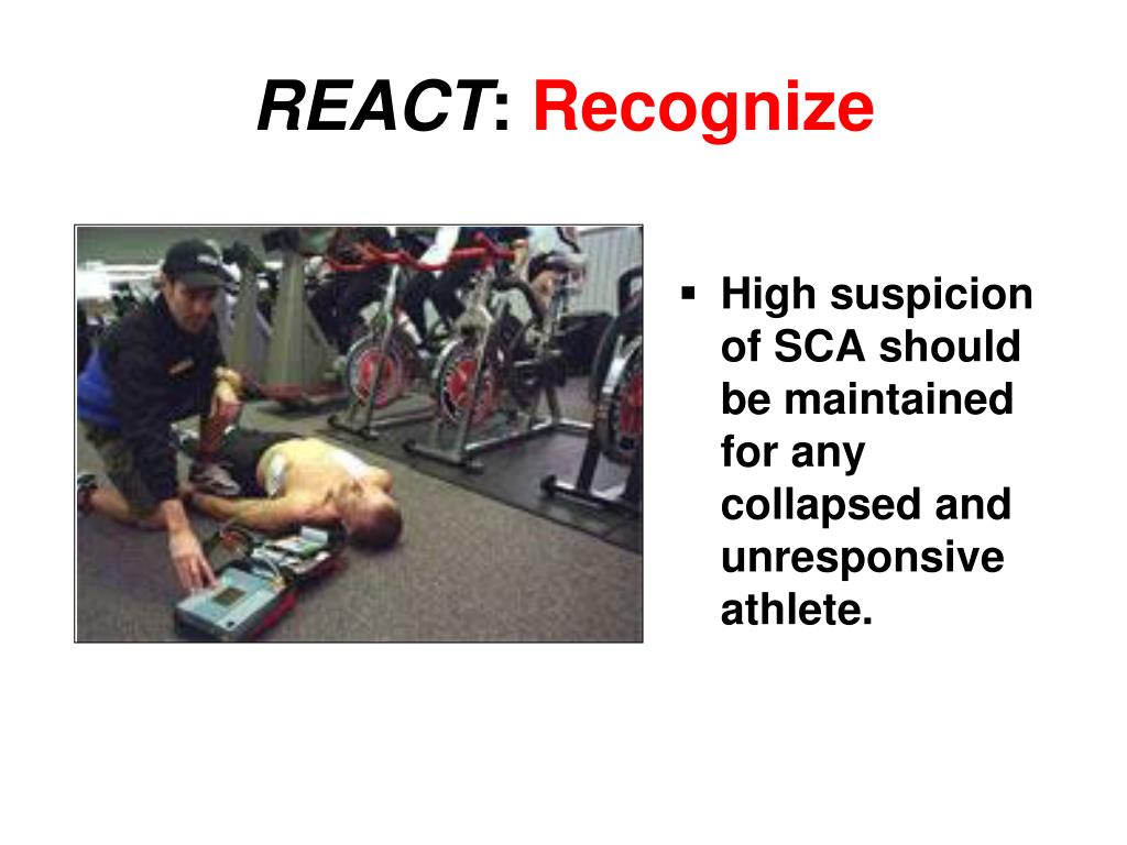 REACT: Recognize • High suspicion of SCA should be maintained for any collapsed and unresponsive athlete.