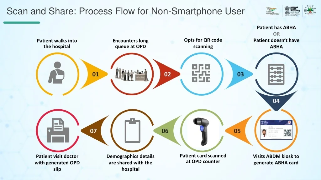 17. Scan and Share: Process Flow for Smartphone User Opts for ABHA Assisted process Patient open ABDM enabled PHR App Patient walks into the hospital Encounters long queue at OPD 01 02 03 04 07 06 05 Patient gets the OPD slip from the counter Patient waits until token displayed at OPD counter Patient receives a token in PHR App Patient shares profile with the hospital 17