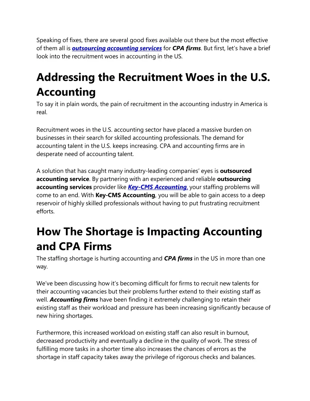 Speakingoffixes,thereareseveralgoodfixesavailableouttherebutthemosteffective ofthemallisoutsourcingaccountingservicesforCPAfirms.Butfirst,let’shaveabrief lookintotherecruitmentwoesinaccountinginthe US. AddressingtheRecruitmentWoesinthe U.S. Accounting Tosayitinplainwords,thepainofrecruitmentintheaccountingindustryinAmerica is real. RecruitmentwoesintheU.S.accountingsectorhaveplacedamassiveburdenon businessesintheirsearchforskilledaccountingprofessionals.Thedemandfor accountingtalentintheU.S.keepsincreasing.CPAandaccountingfirmsarein desperateneedofaccountingtalent. Asolutionthathascaughtmanyindustry-leadingcompanies’eyesisoutsourced accountingservice.Bypartneringwithanexperiencedandreliableoutsourcing accountingservicesproviderlikeKey-CMSAccounting,yourstaffingproblemswill cometoanend.With Key-CMSAccounting,youwillbeabletogainaccesstoa deep reservoirofhighlyskilledprofessionalswithouthavingtoputfrustratingrecruitment efforts. HowTheShortageisImpactingAccounting andCPAFirms ThestaffingshortageishurtingaccountingandCPAfirmsintheUSinmorethanone way. We’vebeendiscussinghowit’sbecomingdifficultforfirmstorecruitnewtalents fortheiraccountingvacanciesbuttheirproblemsfurtherextendtotheirexistingstaff as well.Accountingfirmshavebeenfindingitextremelychallengingtoretaintheirexistingstaffastheirworkloadandpressurehasbeenincreasingsignificantlybecauseof newhiringshortages. Furthermore,thisincreasedworkloadonexistingstaffcanalsoresultinburnout, decreasedproductivityandeventuallyadeclineinthequalityofwork.Thestress of fulfillingmoretasksinashortertimealsoincreasesthechancesoferrorsas the shortageinstaffcapacitytakesawaytheprivilegeofrigorouschecksandbalances.