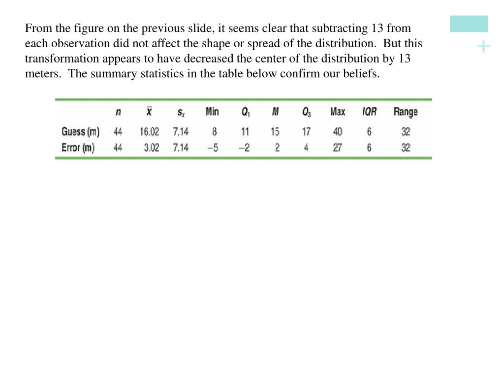 From the figure on the previous slide, it seems clear that subtracting 13 from each observation did not affect the shape or spread of the distribution. But this transformation appears to have decreased the center of the distribution by 13 meters. The summary statistics in the table below confirm our beliefs.