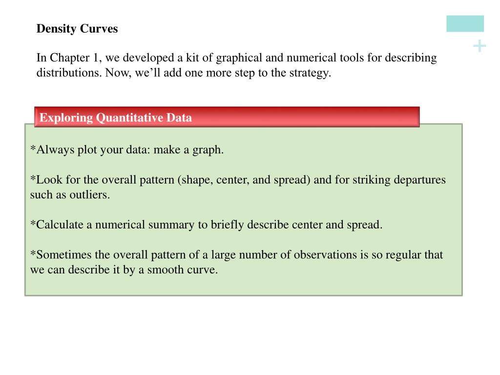 Density Curves In Chapter 1, we developed a kit of graphical and numerical tools for describing distributions. Now, we’ll add one more step to the strategy. Exploring Quantitative Data *Always plot your data: make a graph. *Look for the overall pattern (shape, center, and spread) and for striking departures such as outliers. *Calculate a numerical summary to briefly describe center and spread. *Sometimes the overall pattern of a large number of observations is so regular that we can describe it by a smooth curve.
