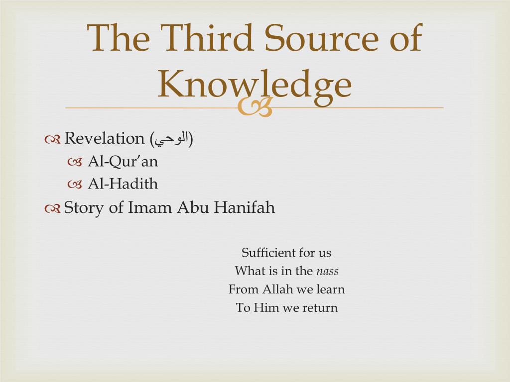 The Third Source of Knowledge • Revelation (الوحي) • Al-Qur’an • Al-Hadith • Story of Imam Abu Hanifah Sufficient for us What is in the nass From Allah we learn To Him we return