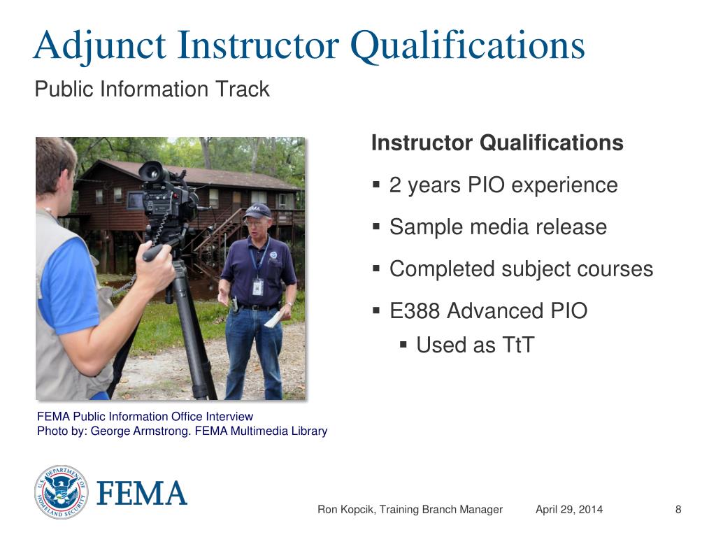 Adjunct Instructor Qualifications Public Information Track Instructor Qualifications • 2 years PIO experience • Sample media release • Completed subject courses • E388 Advanced PIO • Used as TtT FEMA Public Information Office Interview Photo by: George Armstrong. FEMA Multimedia Library