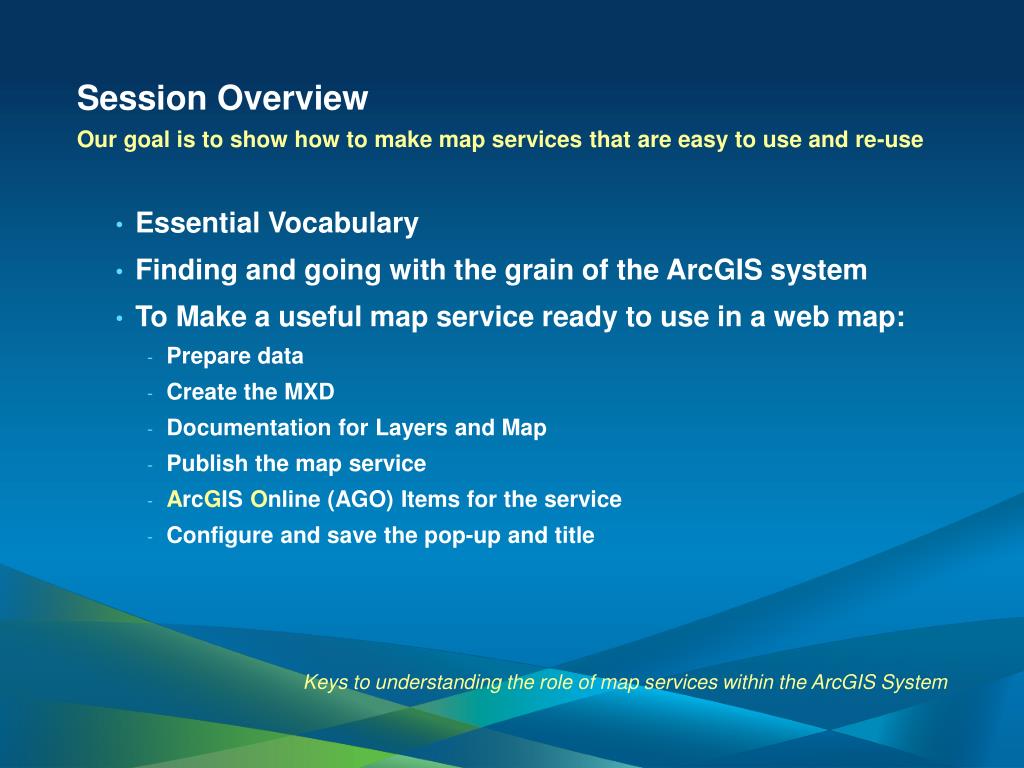 Session Overview Our goal is to show how to make map services that are easy to use and re-use Keys to understanding the role of map services within the ArcGIS System • Essential Vocabulary • Finding and going with the grain of the ArcGIS system • To Make a useful map service ready to use in a web map: • Prepare data • Create the MXD • Documentation for Layers and Map • Publish the map service • ArcGIS Online (AGO) Items for the service • Configure and save the pop-up and title