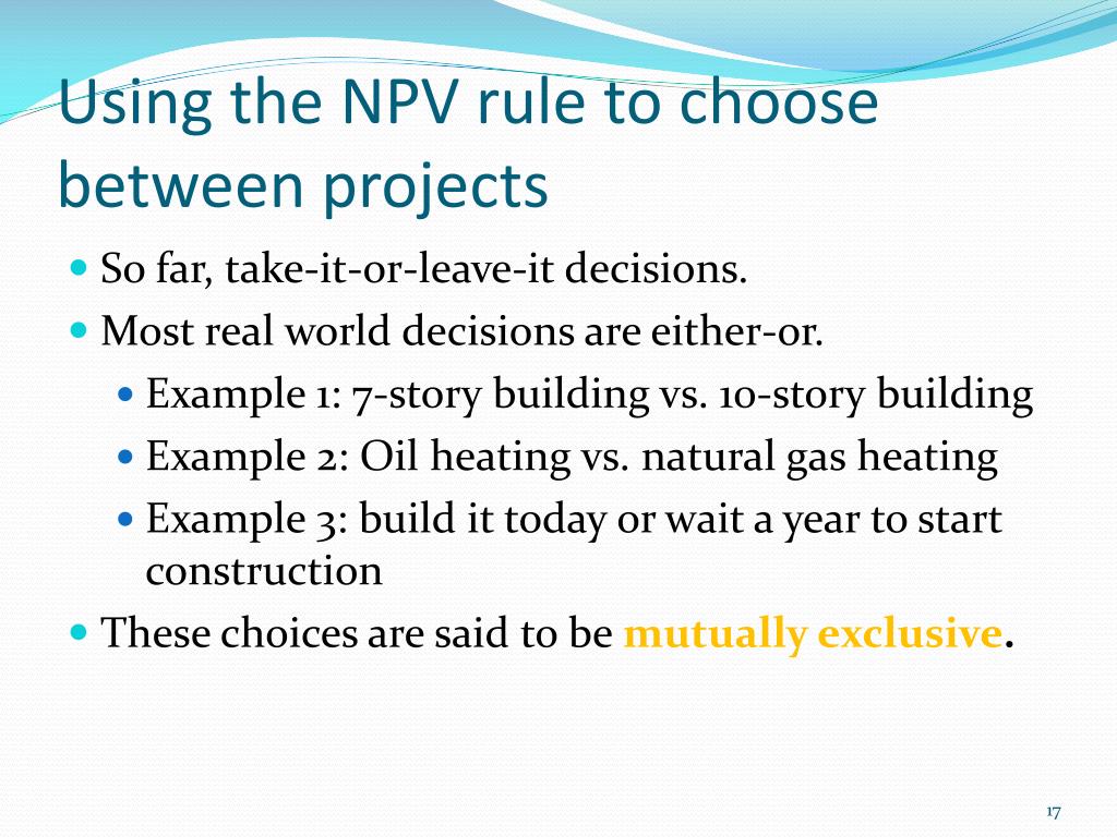Using the NPV rule to choose between projects • So far, take-it-or-leave-it decisions. • Most real world decisions are either-or. • Example 1: 7-story building vs. 10-story building • Example 2: Oil heating vs. natural gas heating • Example 3: build it today or wait a year to start construction • These choices are said to be mutually exclusive.