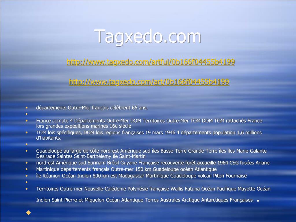 Tagxedo.comhttp://www.tagxedo.com/artful/0b166f04455b4199http://www.tagxedo.com/art/0b166f04455b4199Tagxedo.comhttp://www.tagxedo.com/artful/0b166f04455b4199http://www.tagxedo.com/art/0b166f04455b4199 • départementsOutre-Merfrançaiscélèbrent 65 ans. France compte 4 DépartementsOutre-Mer DOM TerritoiresOutre-Mer TOM DOM TOM rattachés France lorsgrandesexpéditions marines 16e siècle TOM loisspécifiques, DOM loisrégionsfrançaises 19 mars 1946 4 départements population 1,6 millions d’habitants. Guadeloupe au large de côtenord-estAmériquesudîles Basse-Terre Grande-Terre îlesîles Marie-GalanteDésiradeSaintes Saint-Barthélemyîle Saint-Martin nord-estAmériquesud Surinam BrésilGuyaneFrançaiserecouverteforêtaccueille 1964 CSG fuséesAriane Martinique départementsfrançaisOutre-mer 150 km Guadeloupe océanAtlantiqueîleRéunionOcéanIndien 800 km est Madagascar Martinique Guadeloupe volcan Piton FournaiseTerritoiresOutre-mer Nouvelle-CalédoniePolynésiefrançaise Wallis Futuna OcéanPacifique Mayotte OcéanIndien Saint-Pierre-et-Miquelon OcéanAtlantiqueTerresAustralesArctiqueAntarctiquesFrançaises .