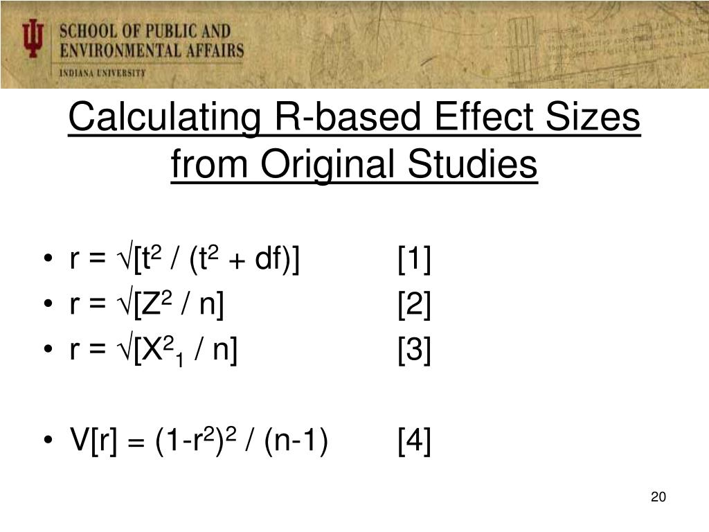 Calculating R-based Effect Sizes from Original Studies • r = √[t2 / (t2 + df)] [1] • r = √[Z2 / n] [2] • r = √[Χ21 / n] [3] • V[r] = (1-r2)2 / (n-1) [4]