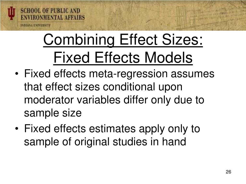 Combining Effect Sizes: Fixed Effects Models • Fixed effects meta-regression assumes that effect sizes conditional upon moderator variables differ only due to sample size • Fixed effects estimates apply only to sample of original studies in hand
