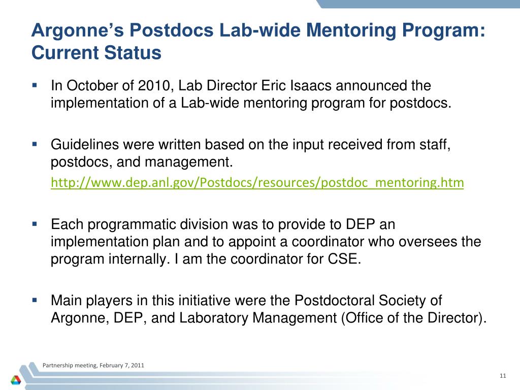 Argonne’s Postdocs Lab-wide Mentoring Program: Current Status • In October of 2010, Lab Director Eric Isaacs announced the implementation of a Lab-wide mentoring program for postdocs. • Guidelines were written based on the input received from staff, postdocs, and management. http://www.dep.anl.gov/Postdocs/resources/postdoc_mentoring.htm • Each programmatic division was to provide to DEP an implementation plan and to appoint a coordinator who oversees the program internally. I am the coordinator for CSE. • Main players in this initiative were the Postdoctoral Society of Argonne, DEP, and Laboratory Management (Office of the Director). Partnership meeting, February 7, 2011