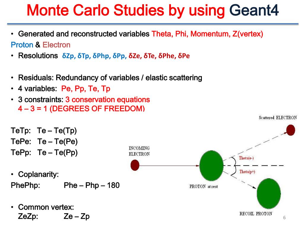 Monte Carlo Studies by using Geant4 • Generated and reconstructed variables Theta, Phi, Momentum, Z(vertex) • Proton& Electron • Resolutions δZp, δTp, δPhp, δPp, δZe, δTe, δPhe, δPe • Residuals: Redundancy of variables / elastic scattering • 4 variables: Pe, Pp, Te, Tp • 3 constraints: 3 conservation equations4 – 3 = 1 (DEGREES OF FREEDOM) • TeTp: Te – Te(Tp) • TePe: Te – Te(Pe) • TePp: Te – Te(Pp) • Coplanarity: • PhePhp: Phe – Php – 180 • Common vertex:ZeZp: Ze – Zp