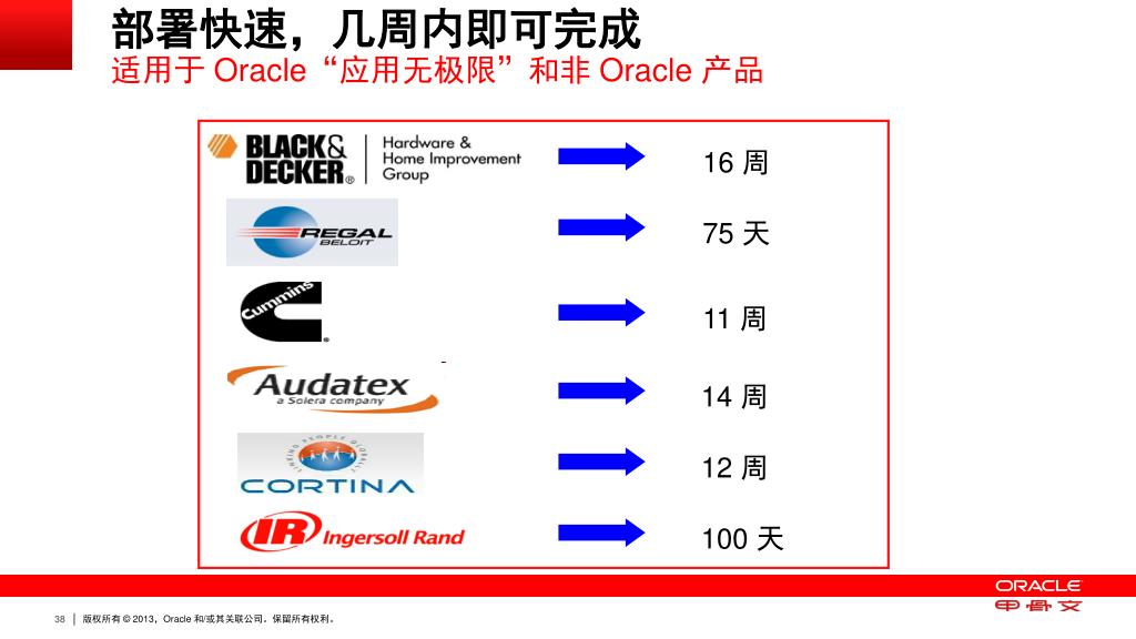 部署快速,几周内即可完成适用于 Oracle“应用无极限”和非 Oracle 产品 16 周 75 天 11 周 14 周 12 周 100 天