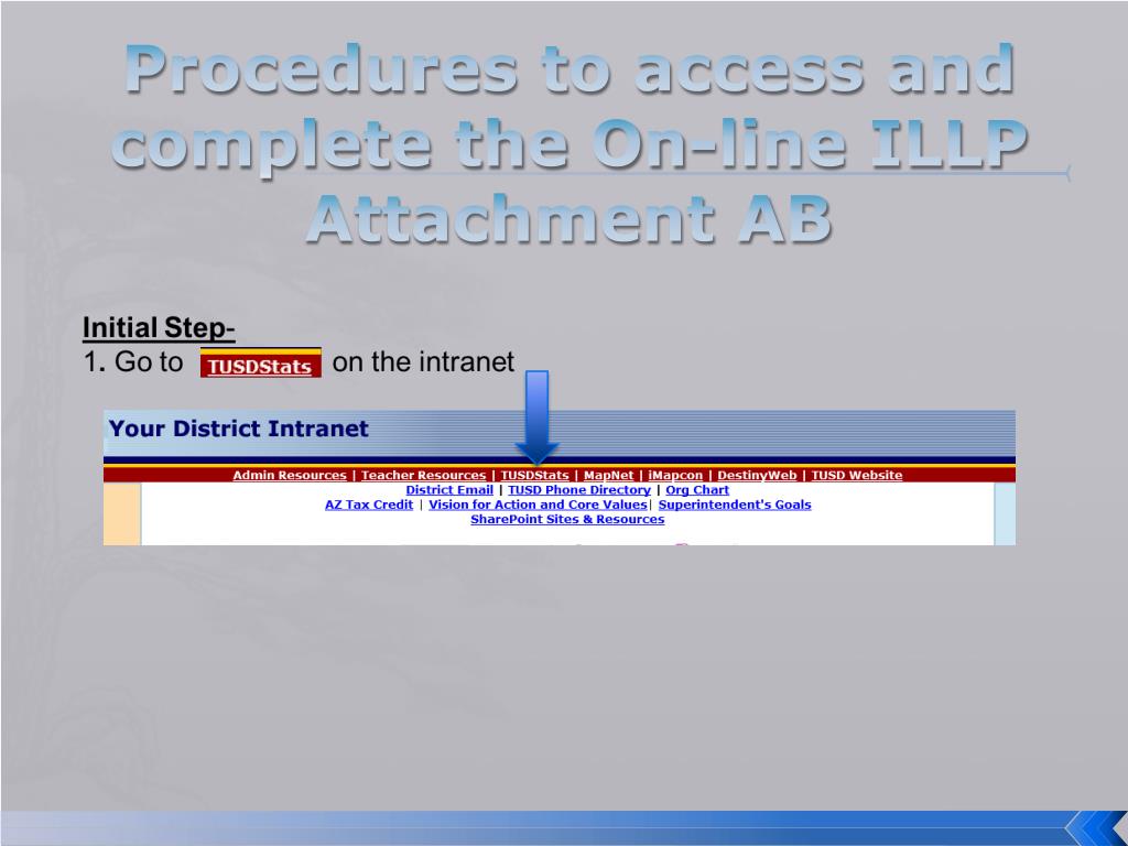 ILLP Online Practice Activity • Log into TUSD STATS • Select a student • Select a time Allocation • Think about the standards you will be covering this quarter • Keep in mind your ELL’s level of AZELLA in each domain • The Resource/ Itinerant teachers have to work together with the classroom teacher of record. It is a collaborative effort. • ADE statement: If more than one teacher is responsible for the instruction for a specific student(s), collaboration should be ongoing to ensure that coordination of instruction is reinforced during the various time allocations • Using the Live links to the AZ ELP standards, select one or two ELP standards to complete a row on the template • Note on the actual ILLP template Attachment AB each time allocation needs to include a minimum of 4 ELP Standards per quarter