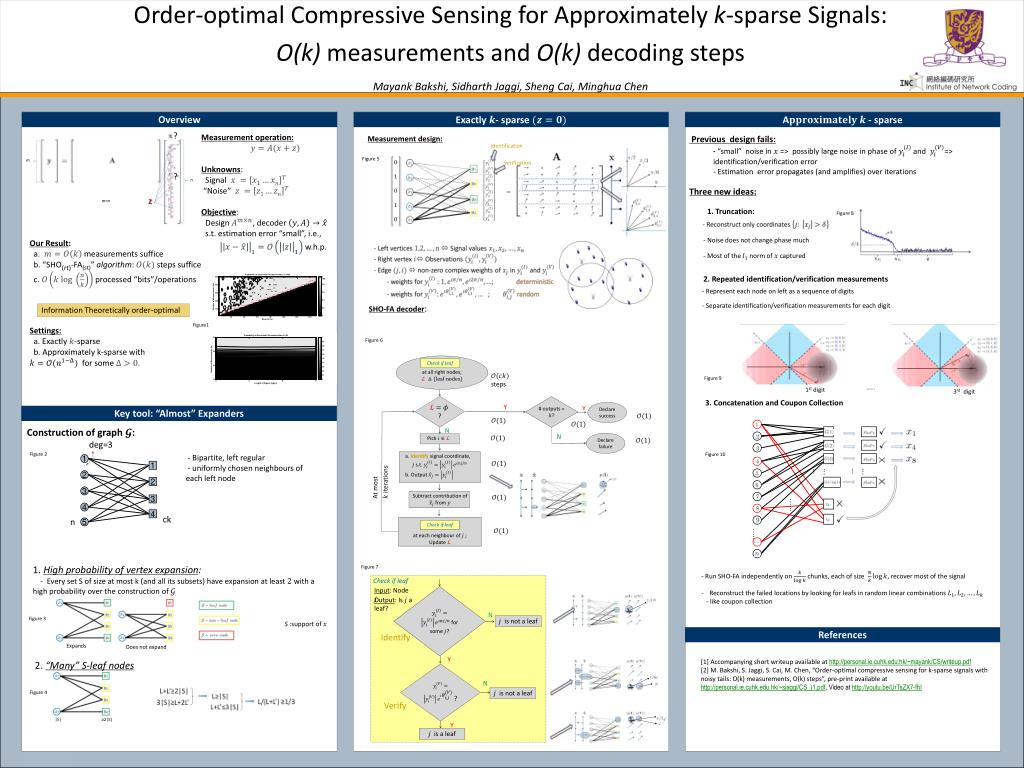 Order-optimal Compressive Sensing for Approximately k-sparse Signals: O(k) measurements and O(k) decoding steps MayankBakshi, SidharthJaggi, Sheng Cai, Minghua Chen Overview Exactly - sparse A- sparse Measurement operation: Unknowns: Signal “Noise” Objective: Design , decoder s.t. estimation error “small”, i.e., w.h.p. Previous design fails: Measurement design: - “small” noise in => possibly large noise in phase of and => identification/verification error - Estimation error propagates (and amplifies) over iterations identification Figure 5 verification Three new ideas: 1. Truncation: Figure 8 - Noise does not change phase much Our Result: a.measurements suffice b. “SHO(rt)-FA(st)” algorithm: steps suffice c. processed “bits”/operations - Most of the norm of captured 2. Repeated identification/verification measurements - Represent each node on left as a sequence of digits - Separate identification/verification measurements for each digit SHO-FAdecoder: Information Theoretically order-optimal Settings: a.Exactly -sparse b. Approximately k-sparse with for some . Figure1 Figure 6 at all right nodes; Check if leaf steps Figure 9 …… 1st digit 3rd digit 3. Concatenation and Coupon Collection ? # outputs = ? Y Declare success Y Key tool: “Almost” Expanders Key tool: “Almost” Expanders Construction of graph : N N Declare failure Pick deg=3 Figure 2 At most iterations Figure 10 - Bipartite, left regular - uniformly chosen neighbours of each left node a. Identify signal coordinate, • s.t. • b. Output 1 …... …... 1 2 Subtract contribution of from 2 …... 3 ck 3 n at each neighbour of ; Update Check if leaf 4 …... 4 5 1. High probability of vertex expansion: - Every set S of size at most k (and all its subsets) have expansion at least with a high probability over the construction of - Run SHO-FA independently on chunks, each of size , recover most of the signal Check if leaf Figure 7 Input: Node for some ? • Reconstruct the failed locations by looking for leafs in random linear combinations • - like coupon collection Output: Is a leaf? N is not a leaf Figure 3 S :support of Identify References Expands Does not expand [1] Accompanying short writeup available at http://personal.ie.cuhk.edu.hk/~mayank/CS/writeup.pdf [2] M. Bakshi, S. Jaggi, S. Cai, M. Chen, “Order-optimal compressive sensing for k-sparse signals with noisy tails: O(k) measurements, O(k) steps”, pre-printavailable at http://personal.ie.cuhk.edu.hk/~sjaggi/CS_)1.pdf, Video at http://youtu.be/UrTsZX7-fhI 2. “Many” S-leaf nodes Y ? N is not a leaf Figure 4 Verify |S| ≥2|S| Y is a leaf