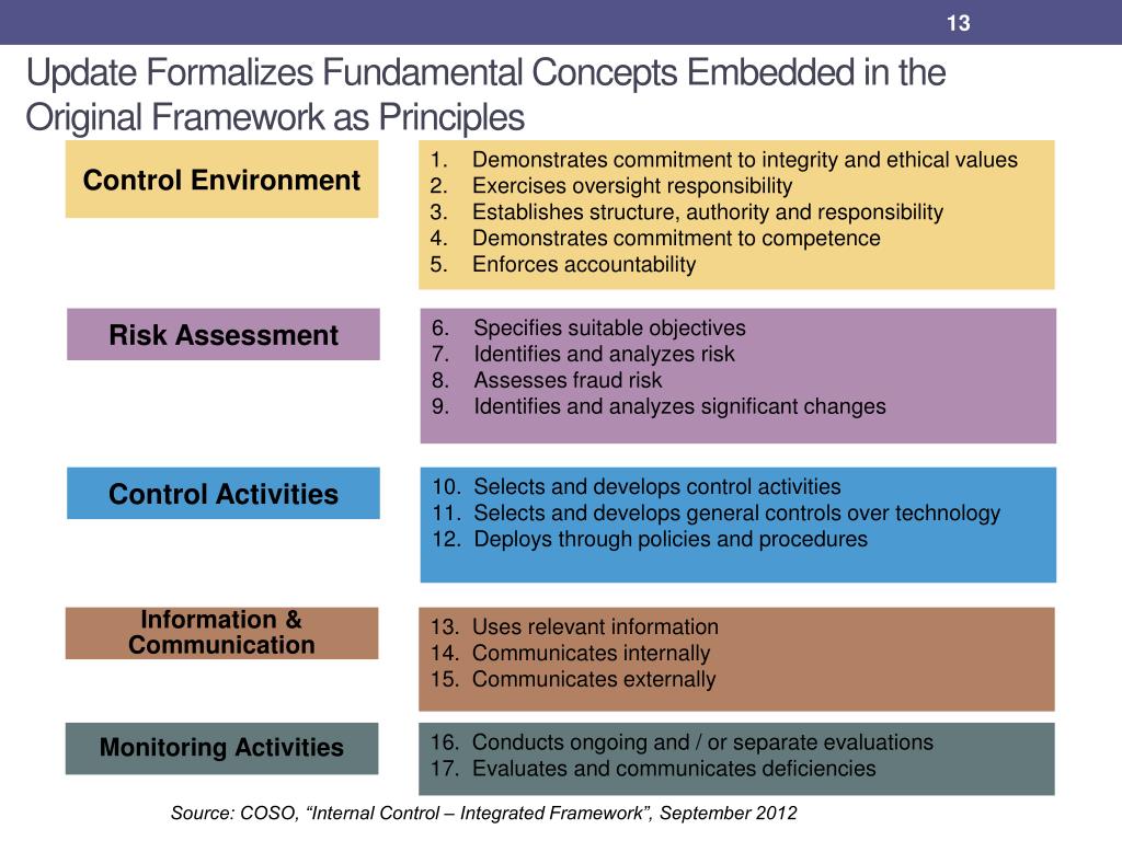 Update Formalizes Fundamental Concepts Embedded in the Original Framework as Principles Control Environment Demonstrates commitment to integrity and ethical values Exercises oversight responsibility Establishes structure, authority and responsibility Demonstrates commitment to competence Enforces accountability Risk Assessment Specifies suitable objectives Identifies and analyzes risk Assesses fraud risk Identifies and analyzes significant changes Control Activities Selects and develops control activities Selects and develops general controls over technology Deploys through policies and procedures Information & Communication Uses relevant information Communicates internally Communicates externally Monitoring Activities Conducts ongoing and / or separate evaluations Evaluates and communicates deficiencies Source: COSO, “Internal Control – Integrated Framework”, September 2012
