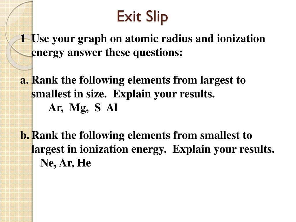 Exit Slip • Use your graph on atomic radius and ionization energy answer these questions: • Rank the following elements from largest to smallest in size. Explain your results. • Ar, Mg, S Al • Rank the following elements from smallest to largest in ionization energy. Explain your results. • Ne, Ar, He