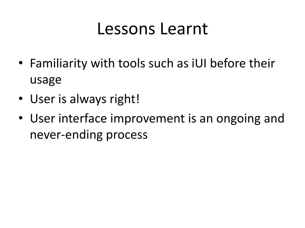 Lessons Learnt • Familiarity with tools such as iUI before their usage • User is always right! • User interface improvement is an ongoing and never-ending process