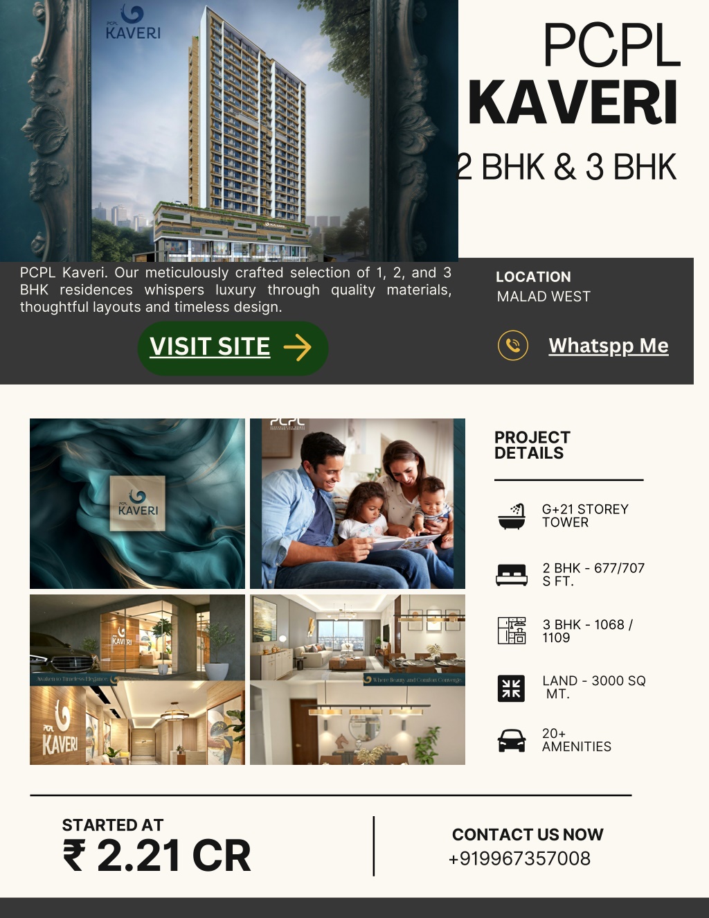 1. PCPL KAVERI 2 BHK & 3 BHK PCPL Kaveri. Our meticulously crafted selection of 1, 2, and 3 BHK residences whispers luxury through quality materials, thoughtful layouts and timeless design. LOCATION MALAD WEST VISIT SITE Whatspp Me PROJECT DETAILS G+21 STOREY TOWER 2 BHK - 677/707 S FT. 3 BHK - 1068 / 1109 LAND - 3000 SQ MT. 20+ AMENITIES STARTED AT ₹ 2.21 CR CONTACT US NOW +919967357008