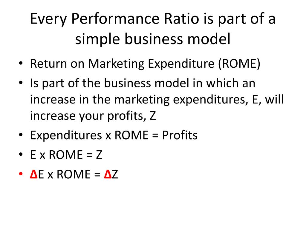 Every Performance Ratio is part of a simple business model • Return on Marketing Expenditure (ROME) • Is part of the business model in which an increase in the marketing expenditures, E, will increase your profits, Z • Expenditures x ROME = Profits • E x ROME = Z • ∆E x ROME = ∆Z