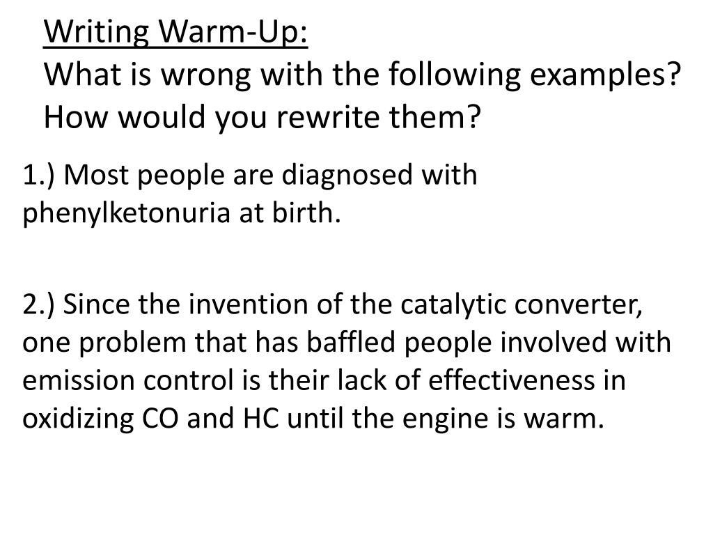 Writing Warm-Up: What is wrong with the following examples? How would you rewrite them? 1.) Most people are diagnosed with phenylketonuria at birth. 2.) Since the invention of the catalytic converter, one problem that has baffled people involved with emission control is their lack of effectiveness in oxidizing CO and HC until the engine is warm.