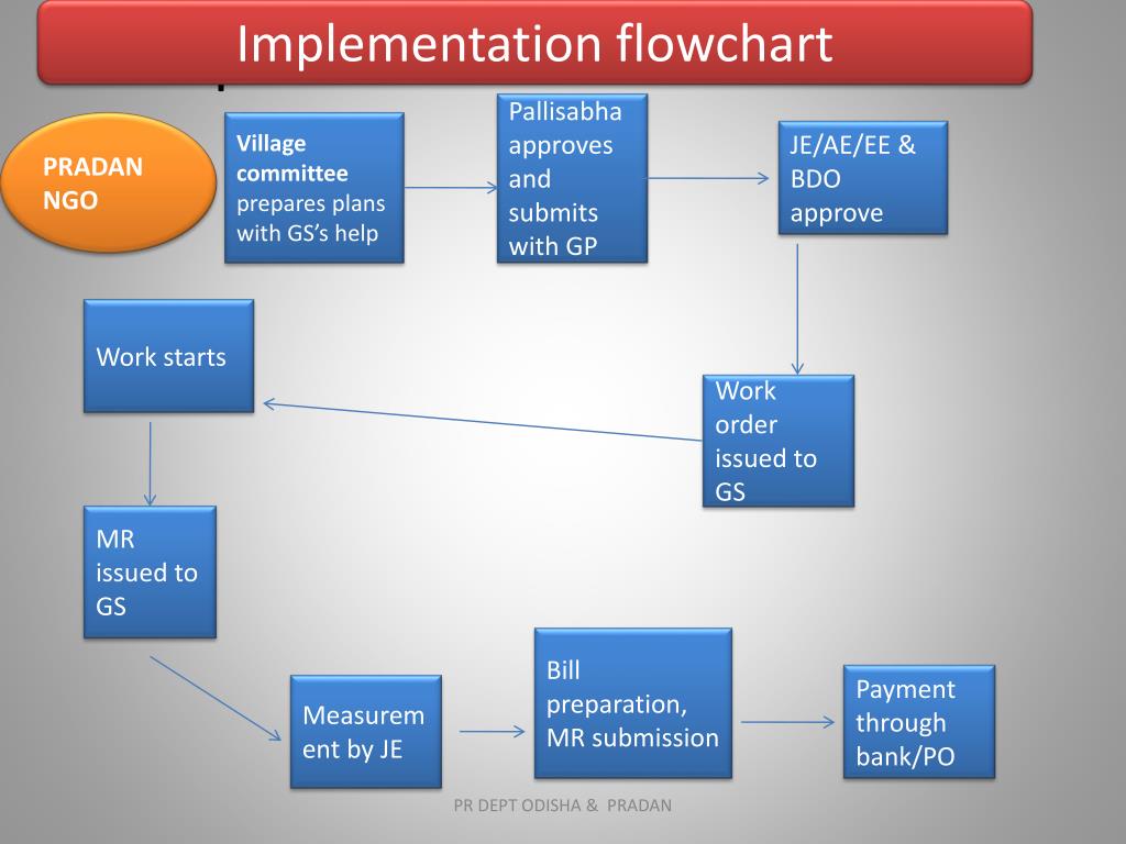 Implementation flowchart Implementation flowchart Pallisabha approves and submits with GP PRADAN NGO Village committee prepares plans with GS’s help JE/AE/EE & BDO approve Work starts Work order issued to GS MR issued to GS Bill preparation, MR submission Payment through bank/PO Measurement by JE PR DEPT ODISHA & PRADAN