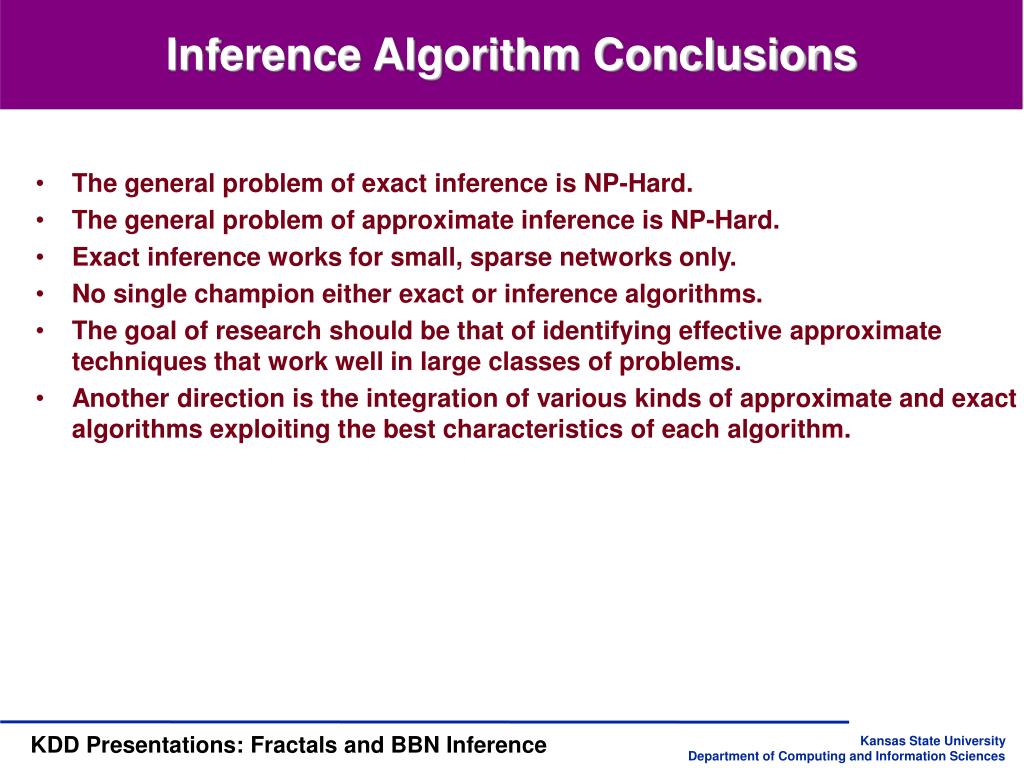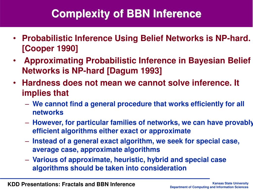 KDD Group Presentation Fractal and Bayesian Networks Inference Saturday, Oct. 12, 2001 Haipeng Guo KDD Research Group Department of Computing and Information Sciences Kansas State University
