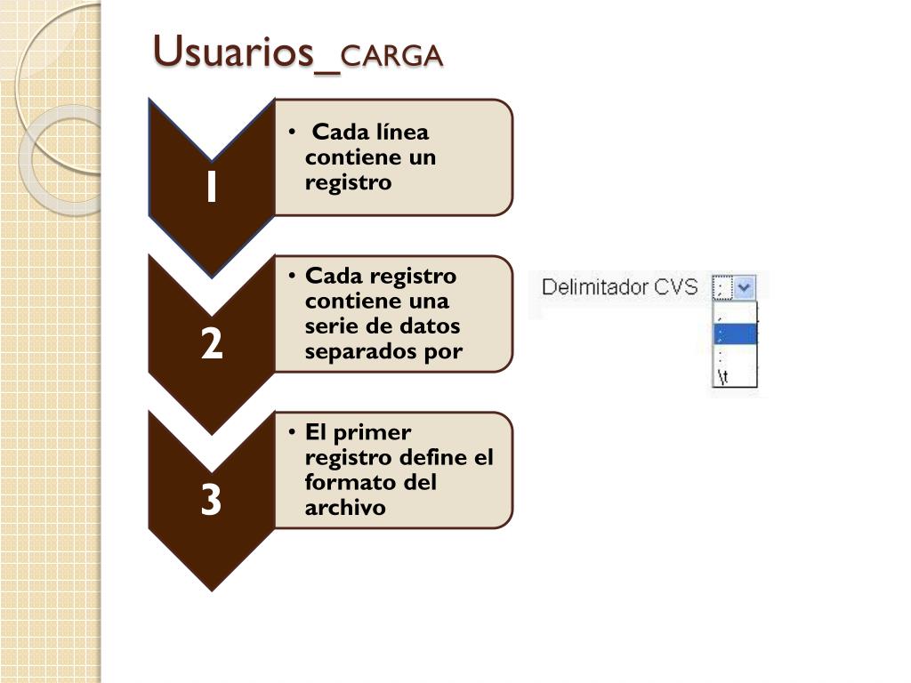 Usuarios_CARGA CSV Los ficheros CSV (del inglés comma-separatedvalues) son un tipo de documento sencillo para representar datos en forma de tabla, en las que las columnas se separan por comas (o punto y coma en donde la coma es el separador decimal: España, Francia, Italia...) y las filas por saltos de línea. Los campos que contengan una coma, un salto de línea o una comilla doble deben ser encerrados entre comillas dobles. El formato CSV es muy sencillo y no indica un juego de caracteres concreto, ni cómo van situados los bytes, ni el formato para el salto de línea. Estos puntos deben indicarse muchas veces al abrir el fichero, por ejemplo, con una hoja de cálculo.